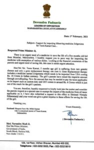 मुंबईतील एका पाच महिन्यांच्या बालिकेच्या उपचारासाठी आवश्यक औषधी अमेरिकेतून आयात करण्यासाठी लागणारे सर्व कर माफ करण्याचा निर्णय केंद्र सरकारने घेतला आहेत. तातडीने हा निर्णय घेतल्याबद्दल माजी मुख्यमंत्री आणि विधानसभेतील विरोधी पक्षनेते देवेंद्र फडणवीस यांनी पंतप्रधान नरेंद्र मोदी यांचे आभार मानले आहेत. यासंदर्भात माहिती फडणवीस यांनी पत्राचा फोटो पोस्ट करत दिली आहे.